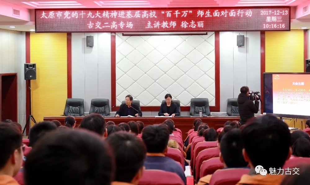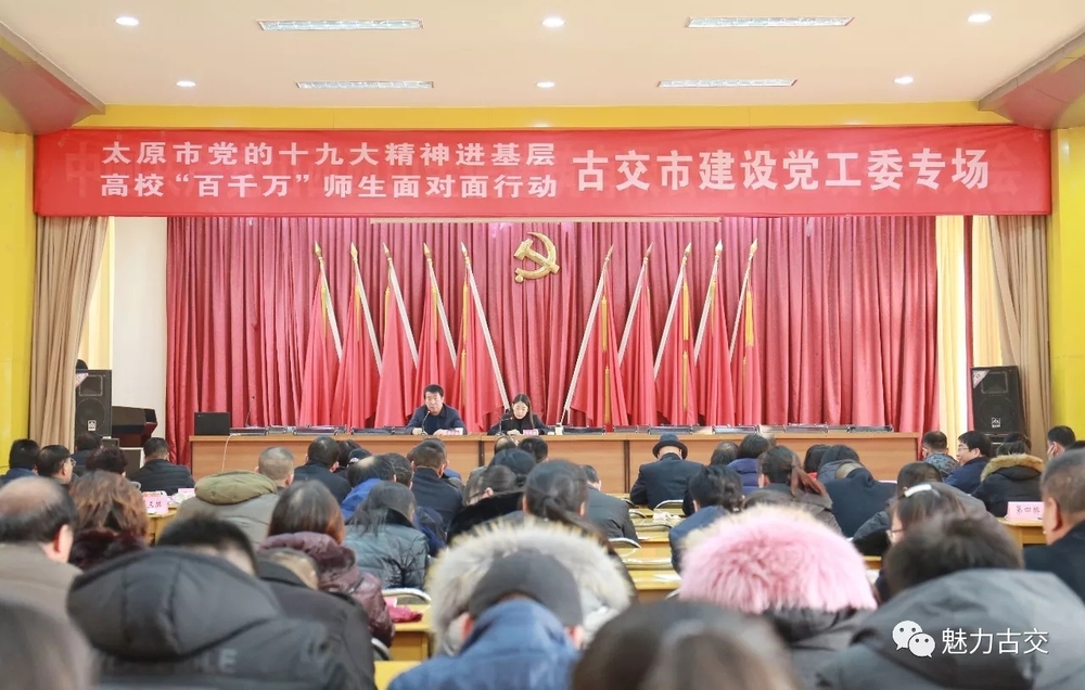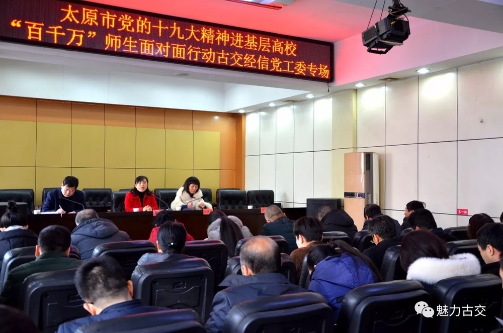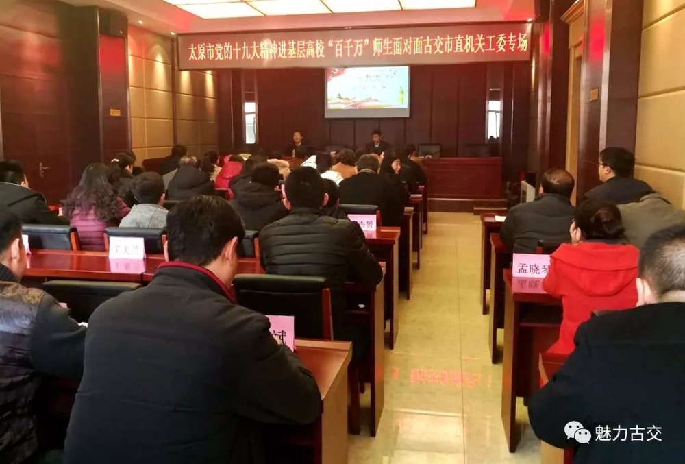 12月13日,海角网党的十九大精神宣讲团一行12人在党委副书记、副校长原美荣带领下,深入古交市卫计系统党委、矾石沟、建设党工委、教育科技党工委、公安局党委、市直机关党工委、经信党工委、离退休党工委等单位,对党的十九大报告进行了详细解读,深入阐释了党的十九大的重大意义。参会人员达1000余人。