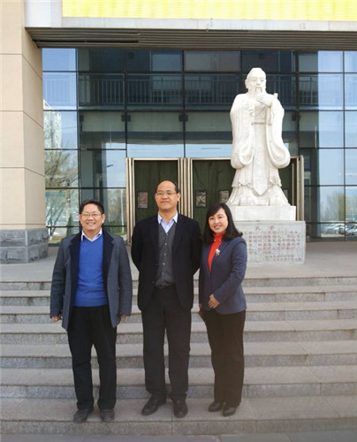 考核组组长高建军与校长宋兴航、校党委副书记原美荣合影