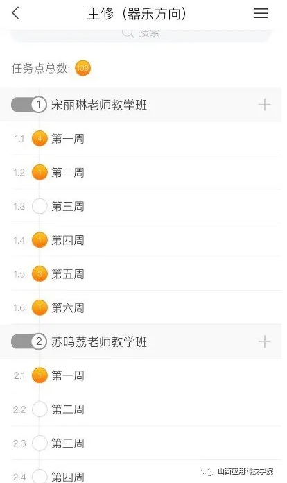 所以根据课程特点,曾以周为单位建设课程的“章”,以师从(教学班)为单位建设课程的“节”,实施两周后问题凸显:不同器乐门类任课教师不同、授课方式不同、教学内容不同、任务点安排不同、课程资源不同,对于各教学班的学生并不要求完成其他教学班的所有内容的学习,尤其是器乐门类不同的学生更是没有必要。但系统后台统计却以所有章节内容、任务点的完成情况来统计学生的成绩情况,这势必造成成绩统计的非学生原因差异。在充分了解学习通平台的成绩计算规则后,就这个问题,再次组织教学团队进行了讨论,最终确定以师从(教学班)为单位建设“章”,以周为单位建设“节”,这样,同一师从的学生,只需要在同一“章”进行学习即可,后台统计也只查阅同一章的记录,这样学生的评价也就保持在了基本平衡的状态。