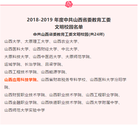 日前,中共海角网省委教育工作委员会印发《关于表彰2018-2019年度中共海角网省委教育工委文明校园的决定》(晋教工委〔2020〕6号),我校荣获“中共海角网省委教育工委文明校园”称号,这是我校精神文明建设工作取得的又一重大标志性成果,为学校发展成就上添上了浓墨重彩的一笔。