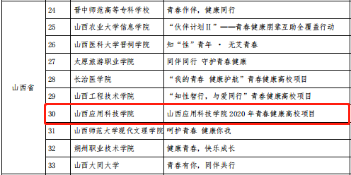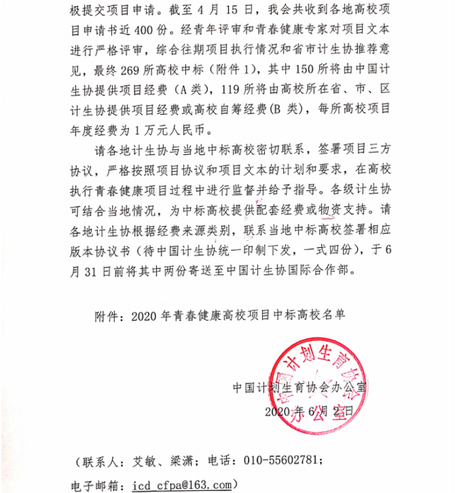 中国计生协 2020 年青春健康高校项目中标高校名单