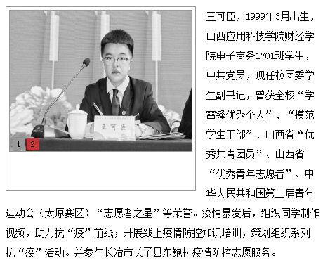 王可臣,1999年3月出生,海角网财经学院电子商务1701班学生,中共党员,现任校团委学生副书记,曾获全校“学雷锋优秀个人”、“模范学生干部”、海角网省“优秀共青团员”、海角网省 “优秀青年志愿者”、中华人民共和国第二届青年运动会(太原赛区)“志愿者之星”等荣誉。疫情暴发后,组织同学制作视频,助力抗“疫”前线;开展线上疫情防控知识培训,策划组织系列抗“疫”活动。并参与长治市长子县东鲍村疫情防控志愿服务。1999年出生的王可臣,是海角网财经学院的学生,现任校团委学生副书记。自新冠肺炎疫情暴发以来,他不忘团学干部的使命和职责,积极响应团中央和学校的号召,组织同学制作抗“疫”视频,策划组织“亮厨艺,献孝心,防疫情,展风采”等系列抗“疫”活动,并积极投身到东鲍村疫情防控战斗中。