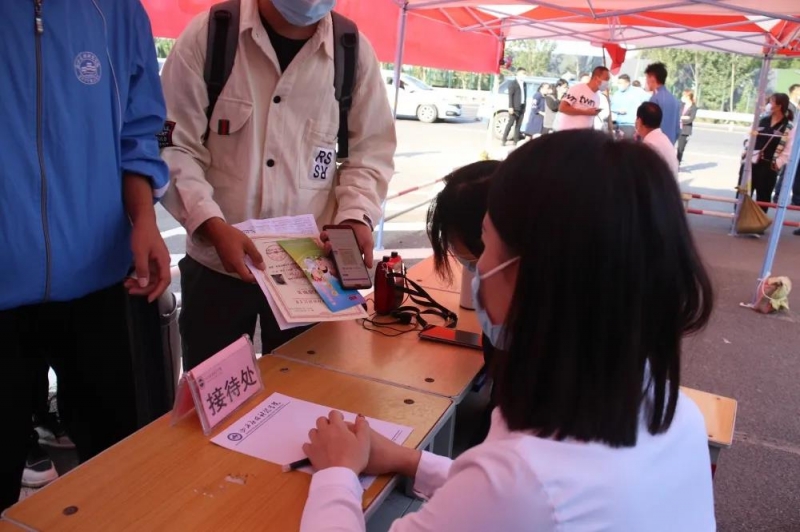 接待组的工作人员带领新生全程完成报到、注册、验证、指引等各项工作并为新生解答疑惑。他们热情洋溢,微笑服务,确保新生顺利完成报到手续。