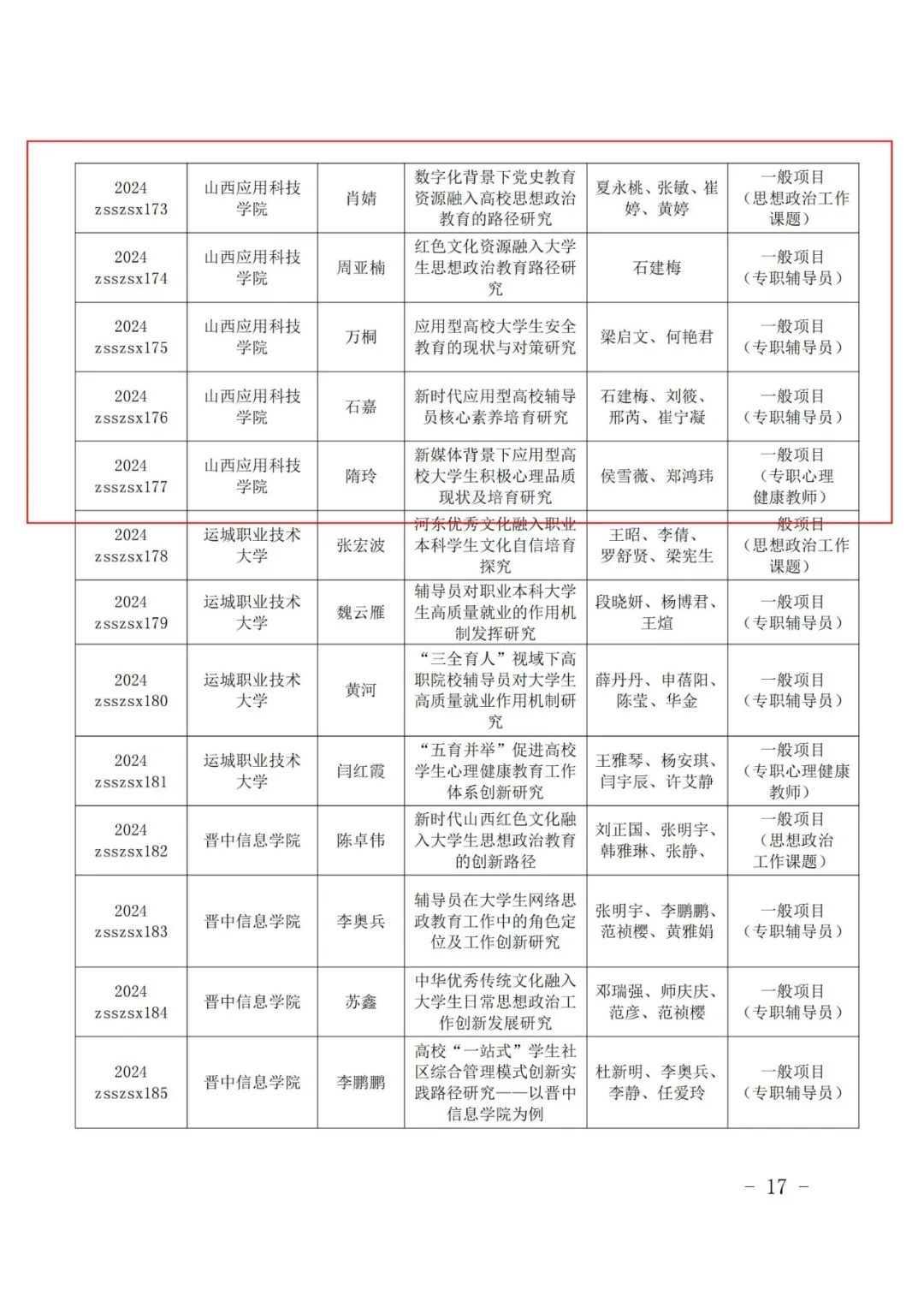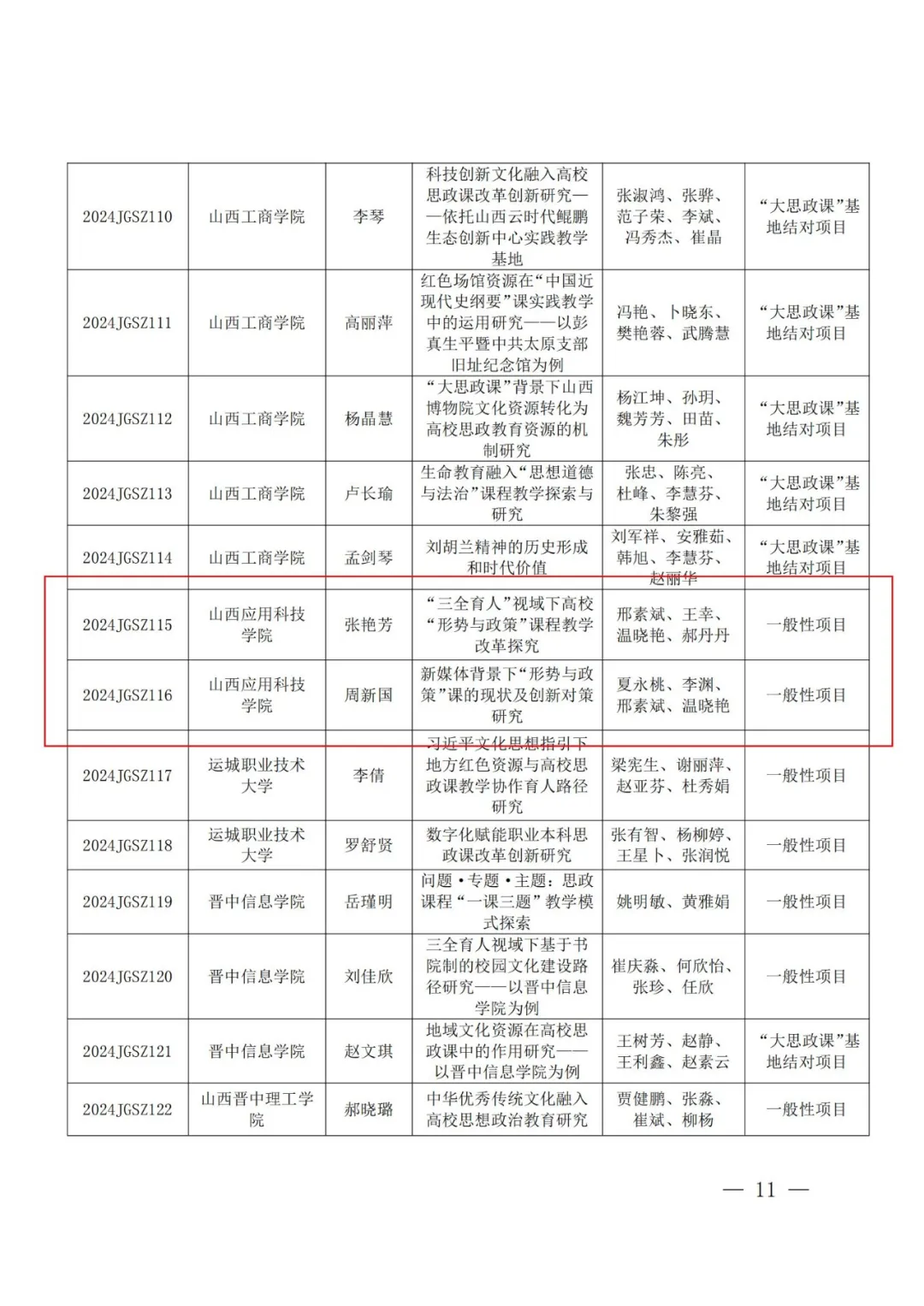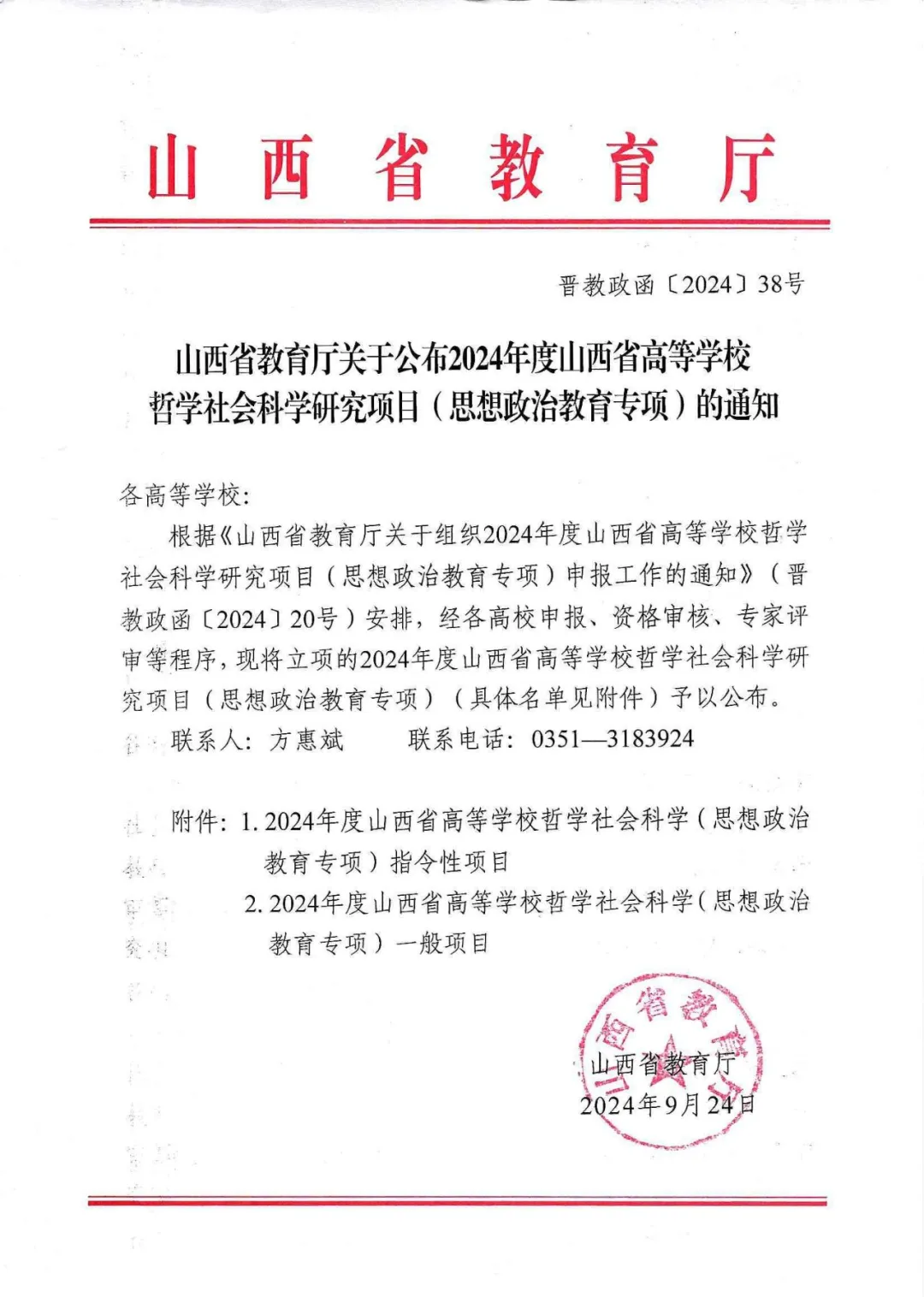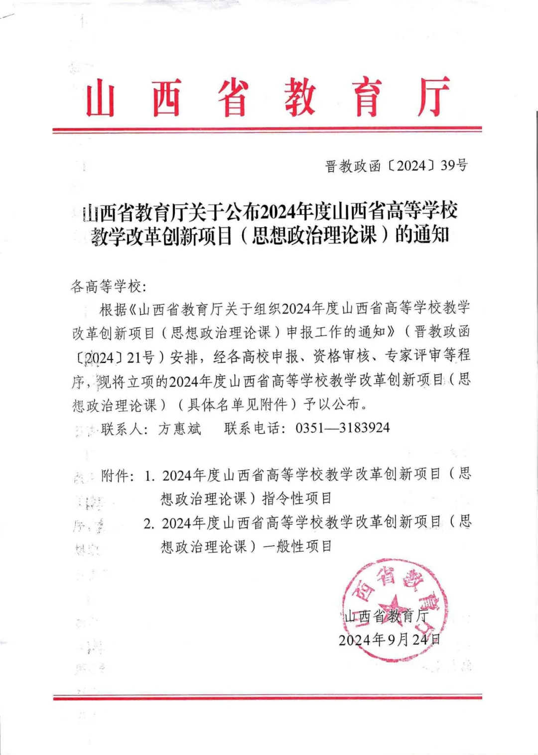 近日,山西省教育厅公布了“2024年度山西省高等学校教学改革创新项目(思想政治理论课)”和“2024年度山西省高等学校哲学社会科学研究项目(思想政治教育专项)”立项名单,我校有2项教学改革创新项目(思想政治理论课)和5项哲学社会科学研究项目(思想政治教育专项)成功立项。
