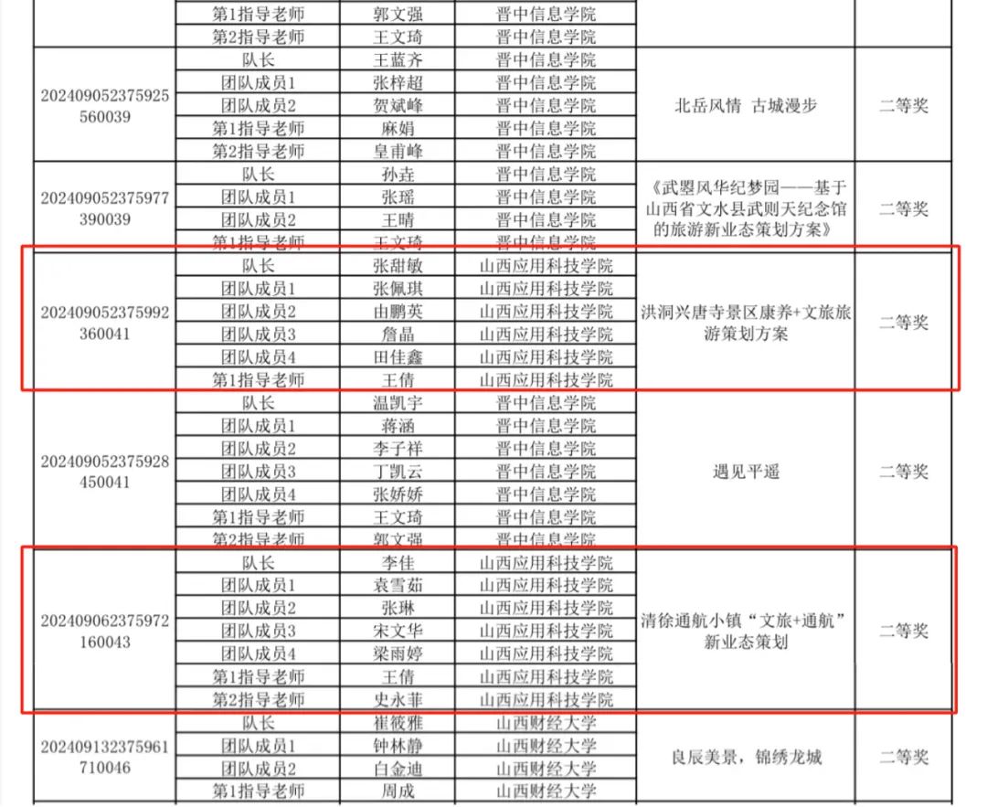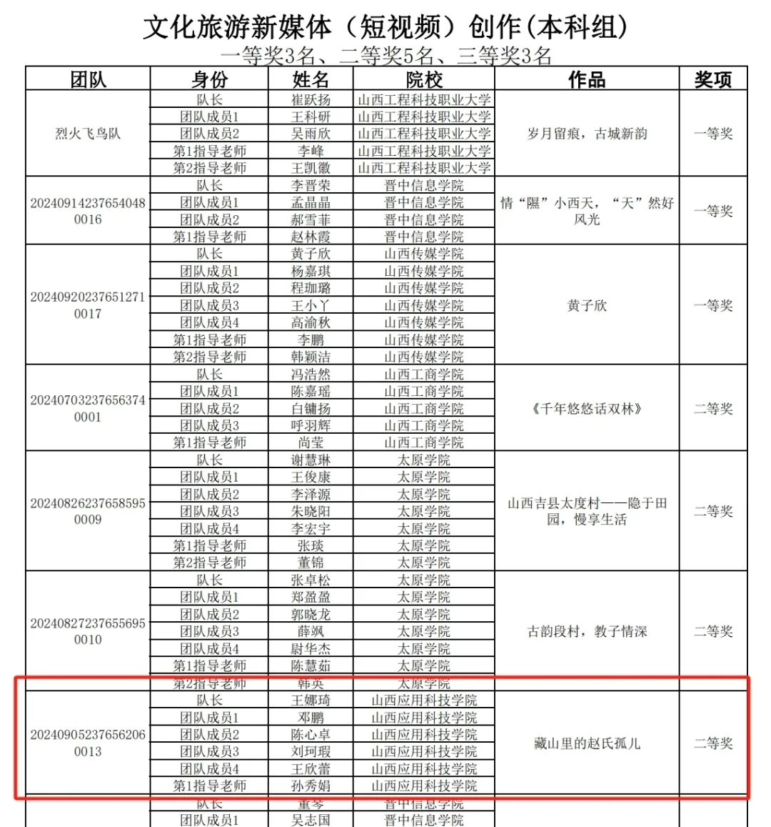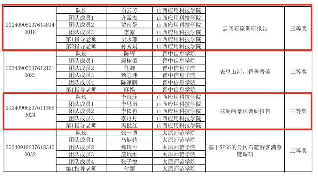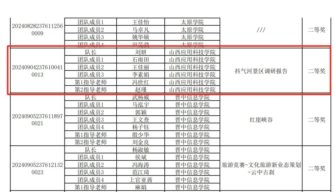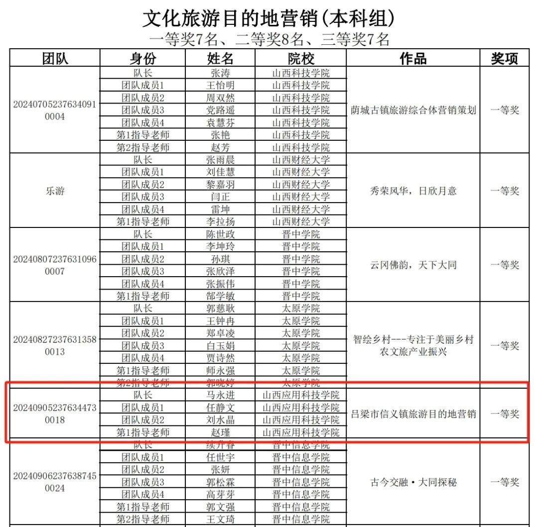 经过与全省17所院校246支团队激烈比拼,我校徐馨玉团队荣获文化旅游项目调研(本科组)一等奖,马永进团队荣获文化旅游目的地营销(本科组)一等奖;张甜敏团队、李佳团队荣获文化旅游新业态策划(本科组)二等奖,刘妍团队荣获文化旅游项目调研(本科组)二等奖,王娜琦团队荣获文化旅游新媒体(短视频)创作(本科组)二等奖,刘水晶团队荣获酒店项目策划(本科组)二等奖;白云芳团队、李京珍荣获文化旅游项目调研(本科组)三等奖,7支荣获一等奖、二等奖队伍将由省赛组委会推荐参加全国总决赛。