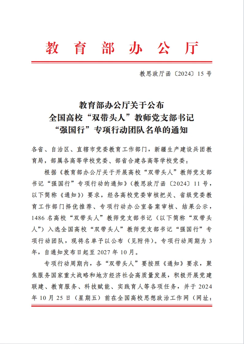 近日,教育部办公厅正式公布了全国高校“双带头人”教师党支部书记“强国行”专项行动团队名单,我校美术学院第一党支部的董霞老师荣耀入选。这一喜讯不仅彰显了我校党建工作的显著成效,也为我校教师队伍树立了新的标杆。