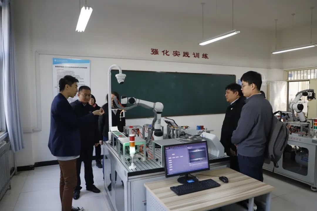 在工科实训楼,领导们细致考察了风力光伏发电、电机拖动、电力电子技术、机器人技术、轨道交通信号与控制、大数据分析、传感器技术等前沿实验室,对学校的实践教学条件表示高度兴趣。